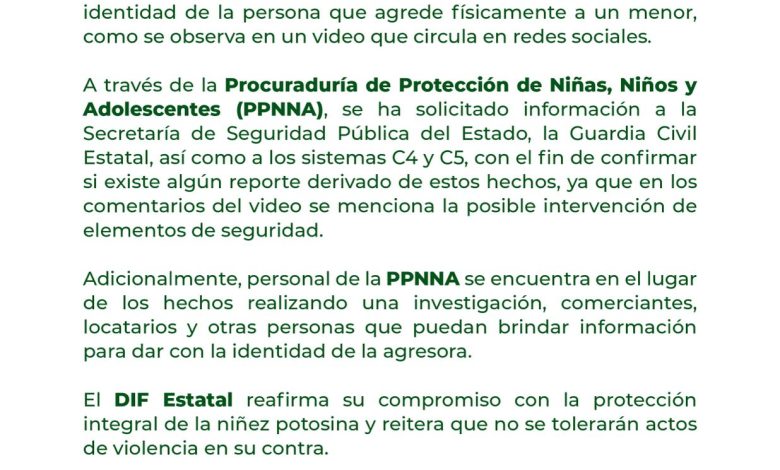 Además, el Sistema DIF Estatal emitió un comunicado en el que señala que la Procuraduría de Protección de Niñas, Niños y Adolescentes realiza las indagatorias correspondientes, y solicitó el apoyo de la población para dar con el paradero de la agresora de la mujer.